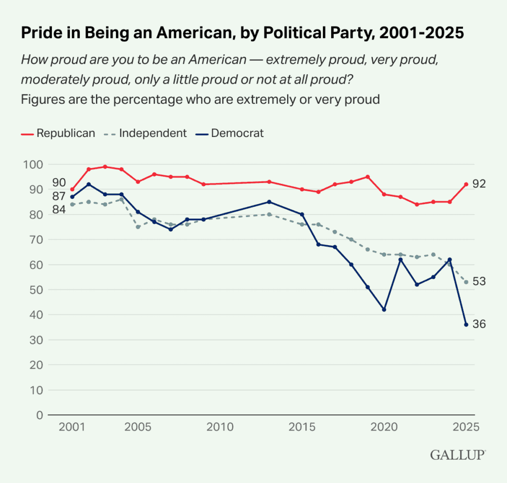 This trend is driven almost entirely by Democrats, whose pride in America has fallen precipitously from 87% in 2001 to just 36% today. At the same time, Republicans’ pride in America has increased from 90% in 2001 to 92% today.