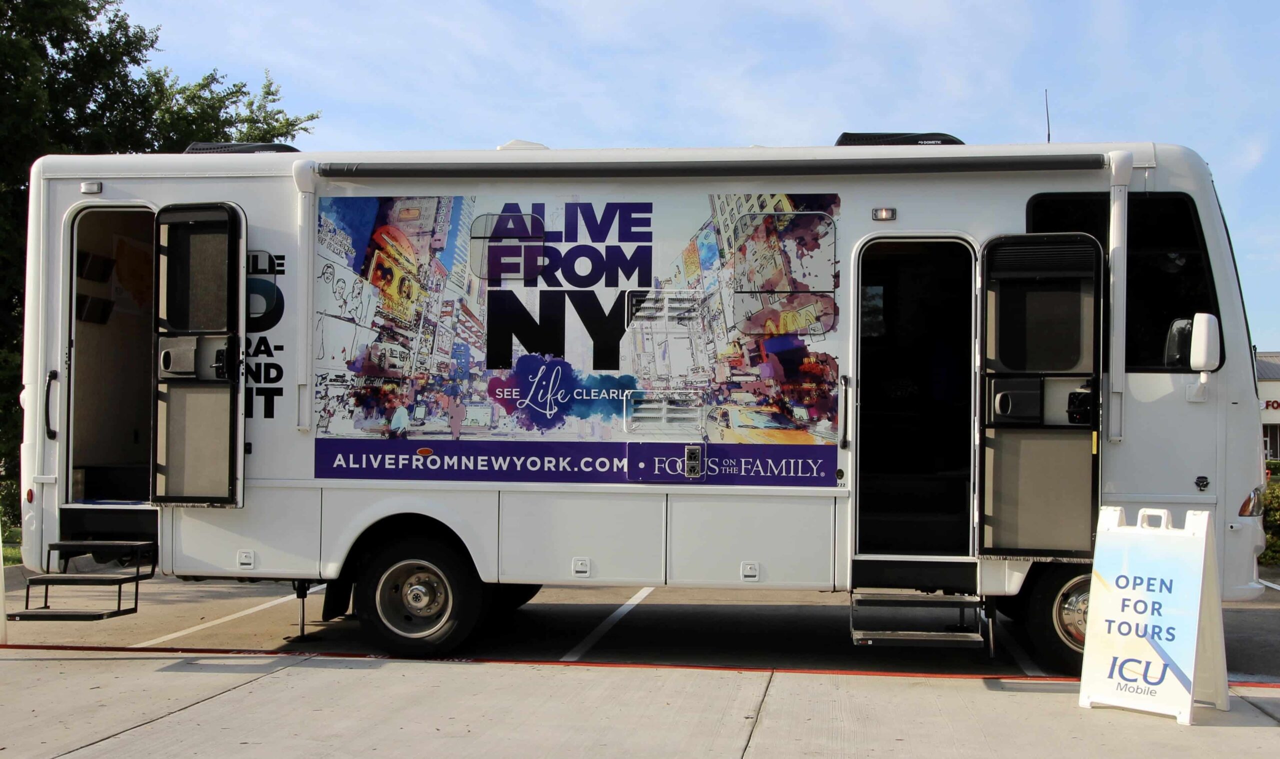 A nonprofit organization, ICU brings pregnancy resource centers (PRC) to communities across the country by converting an RV into a mobile PRC. There is usually a sofa where counseling can be completed, and an ultrasound machine and medical bed in the back that can ensure privacy and dignity. ICU offered to partner with Focus on the Family and bring one of their ultrasound buses into Times Square, which is perfect for the event. A live 4D ultrasound can be performed and the mother’s privacy maintained, but the ultrasound bus roadshow to the event wasn’t easy. The short half country tour of area PRCs, from Dallas, TX to NYC, had some great triumphs and challenges.