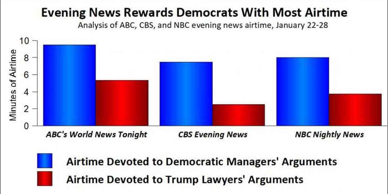 A second imbalance discovered by MRC was that the media gave ample more airtime to the Democrat managers than Trump’s defense team. “In all, the networks covered the Democrat managers for almost 25 minutes (24:57). That’s compared to the 11 minutes and 34 seconds they gave to President Trump’s defense team. The most wildly imbalanced was CBS Evening News, which gave seven minutes, 42 seconds for Democrats and skimped on Trump’s team with two minutes and 26 seconds,” MRC reported.