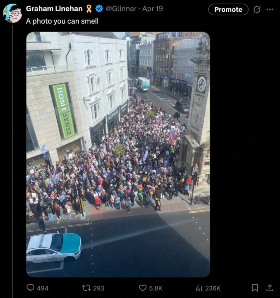 Linehan’s tweet would be protected under America’s First Amendment. Per the U.S. Supreme Court, “The public expression of ideas may not be prohibited because the ideas are themselves offensive to some of their hearers.” (Street v. New York, 1969).