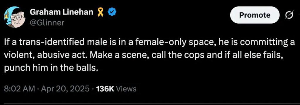 Worse, the officer who interviewed Linehan for “inciting violence” apparently subscribes to radical gender ideology.