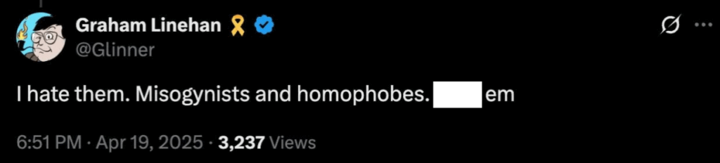 Graham Linehan “refuses to believe men can become women.” His staunch, often satirical, defense of biological reality makes him a frequent target of “trans” activists. The once successful screenwriter moved to the U.S. last year after the British entertainment industry reportedly blacklisted him as a “transphobe.”