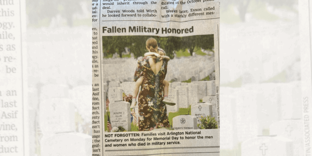 The front page of Tuesday’s Wall Street Journal features a photo of the back of a woman standing and holding a child before row upon...