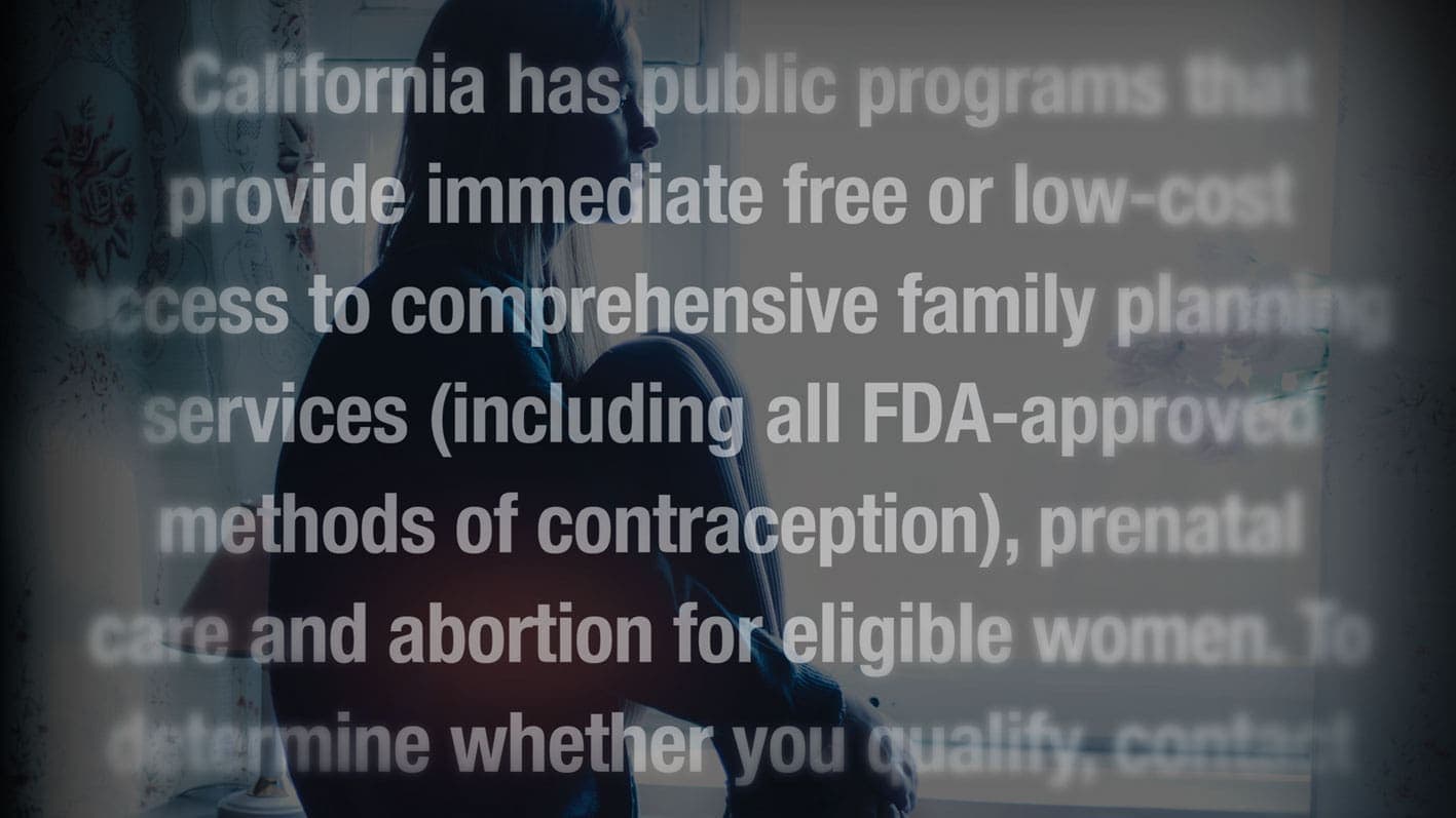 “California has public programs that provide immediate free or low-cost access to comprehensive family planning services (including all FDA-approved methods of contraception), prenatal care and abortion for eligible women. To determine whether you qualify, contact the county social services office at [local telephone number].”