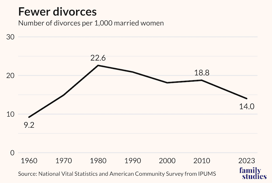 The divorce rate, since the early 1980s, has fallen by nearly 40%. Wilcox remarks much of this improvement “has happened in just the past 15 years.”