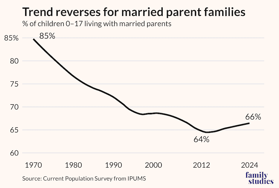 The improving trend in children being born to and living with a married mother and father is more recent to be sure. Wilcox explains, “After falling for more than 40 years beginning in the late 1960s, the share of children living in married families bottomed out at 64% in 2012 before rising to 66% in 2024.”