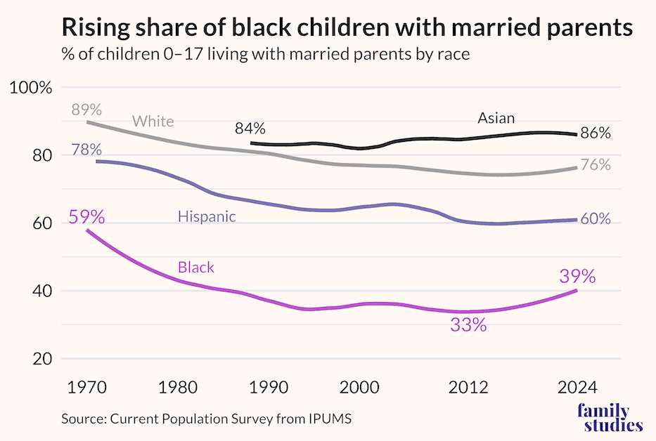 Married births have also risen among historically challenged racial groups. Wilcox explains “the proportion of black children being raised in a married-parent family rose from 33% in 2012 to 39% in 2024.”