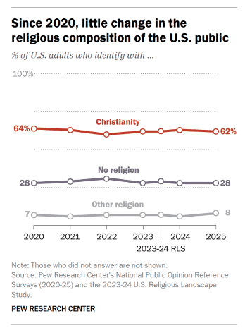 Pew also reports that the shares of American adults “expressing positive views of religion in 2024 and 2025 are up significantly from 2022 and 2019, indicating an overall shift toward more positive views about religion’s role in American life over the past five years or so” (emphasis in original).