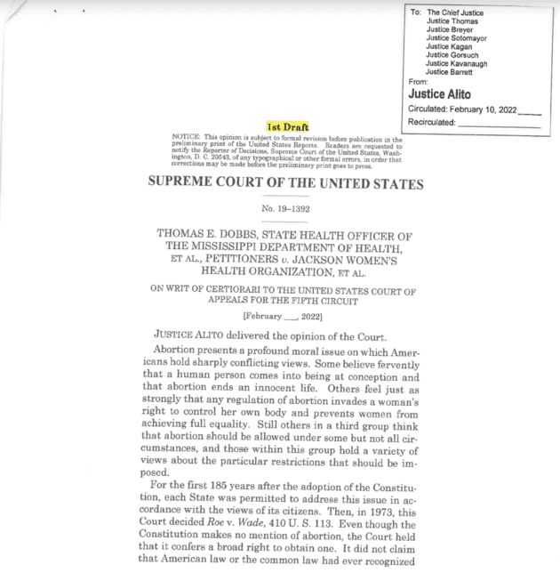 In a story first reported by Politico, the news outlet has obtained what is reportedly a first draft of a majority opinion, authored by Supreme Court Justice Samuel Alito in an abortion case argued last December, that overturns Roe v. Wade while upholding Mississippi’s 15-week abortion ban.