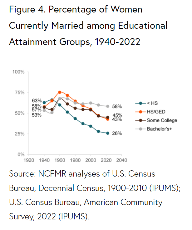 Bowling Green State University data shows marriage rates between different educated groups were generally the same in 1920. Today, college educated women are more than twice as likely to be married as their high school educated peers.