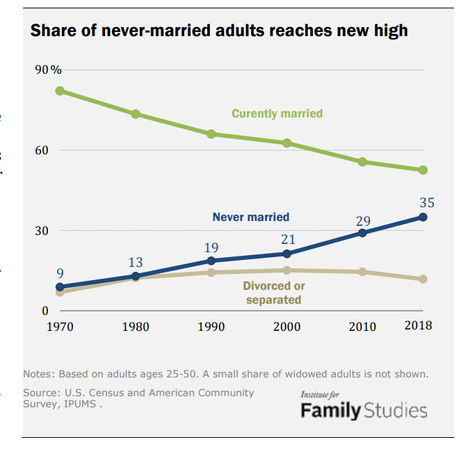 The marriage rate has fallen about 65 percent in the last half century, from a recent peak of almost eighty-six marriages per one thousand unmarried people in 1970. …Declines in marriage and increases in divorce mean that slightly less than one in two adults are currently married, down from about 75 percent in 1960.