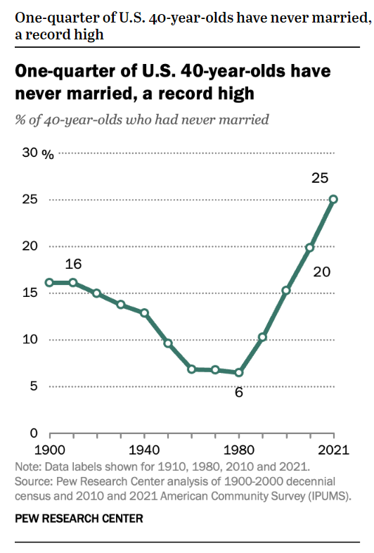 Pew Research Center reports (2023) a dramatic 4-fold increase since 1980 in never married adults in the U.S., a record high.