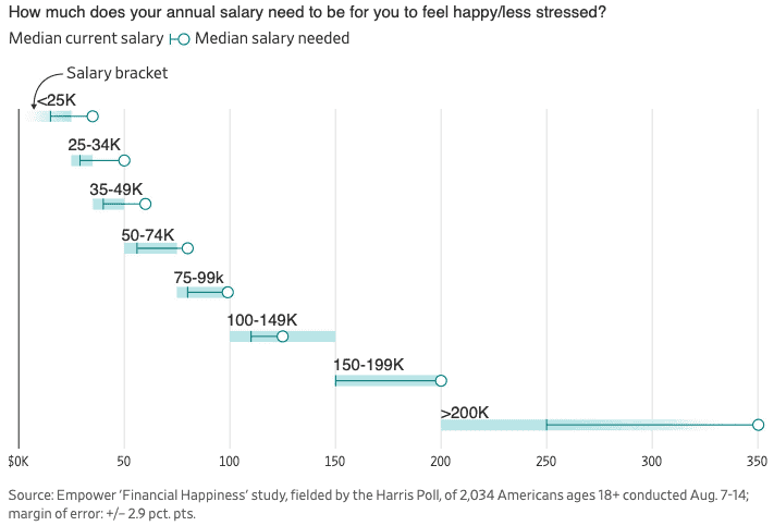 “The respondents, who had a median salary of $65,000 a year, said a median of $95,000 would make them happy and less stressed,” the WSJ reports. “The highest earners, with a median income of $250,000, gave a median response of $350,000.”