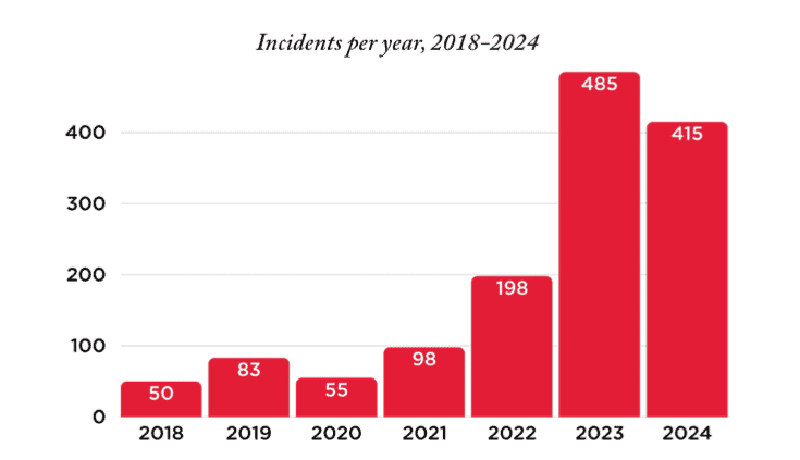 The first report on hostility against churches was published in 2022, but that initial analysis “covered incidents that occurred between January 2018 and September 2022.” While 2023 had the highest number of crimes against churches, at 485, this past year had the second highest number. Overall, there has been a significant increase in attacks on churches since 2018.