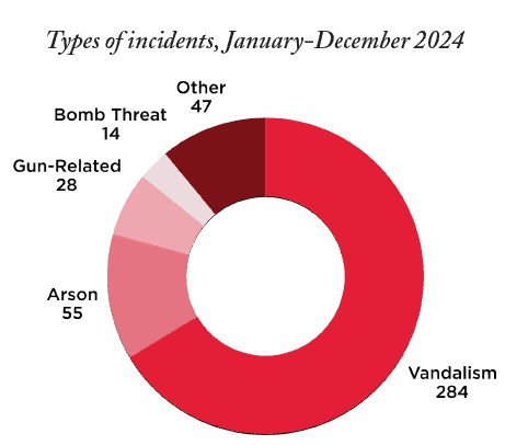 Vandalism was once again the category with the most incidents (284). There were also 55 instances of arson, 14 bomb threats, and 47 “other.” The number of gun-related incidents (28) was more than double the previous year’s total (12). Thirteen incidents fell into more than one category, the most frequent combination being vandalism paired with either gun-related incidents or other forms of physical aggression.