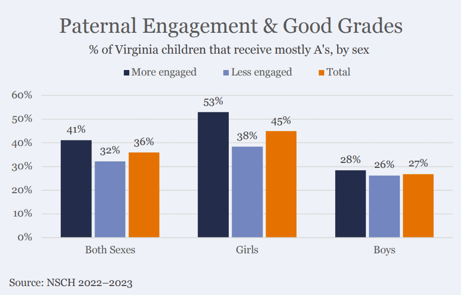 Father engagement has a measurable effect on children earning top grades in school. The following chart shows how fathers’ involvement boosts superior grade attainment for boys and girls.