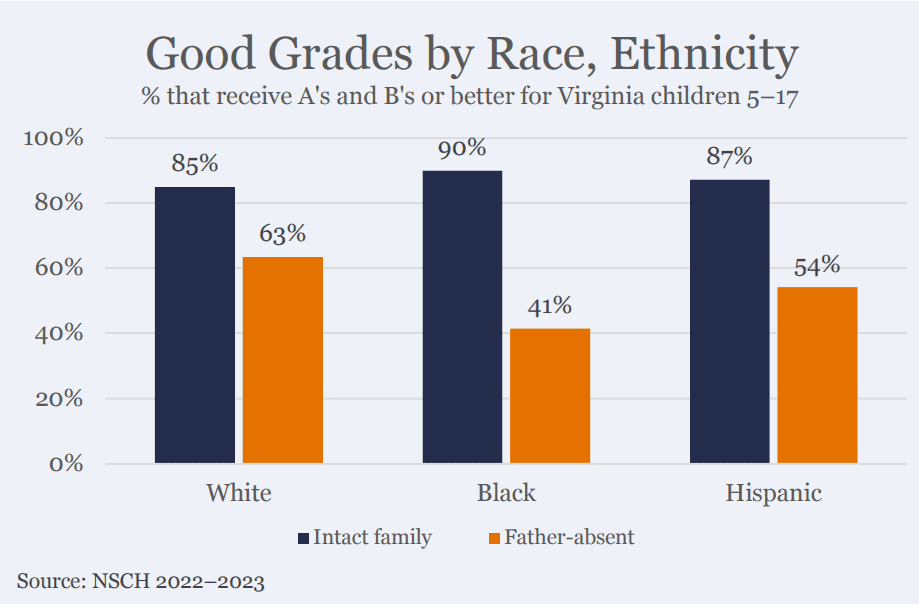 Data indicate both Black and Hispanic kids benefit more strongly from intact families and father involvement than White children do, as show in this graph.