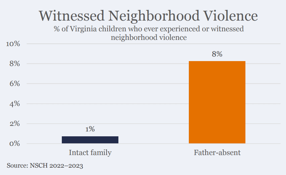 Children living in homes where their mother is married to the father, creating a situation where dad is dramatically more likely to be involved in the lives of their children, translates into dramatic reductions in children ever experiencing or witnessing neighborhood violence. Of course, this is a marked positive indicator for child well-being.