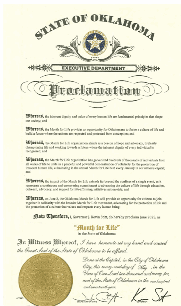 It continues, “The Month for Life provides an opportunity for Oklahoma to foster a culture of life and build a future where the unborn are respected and protected from the moment of conception.”