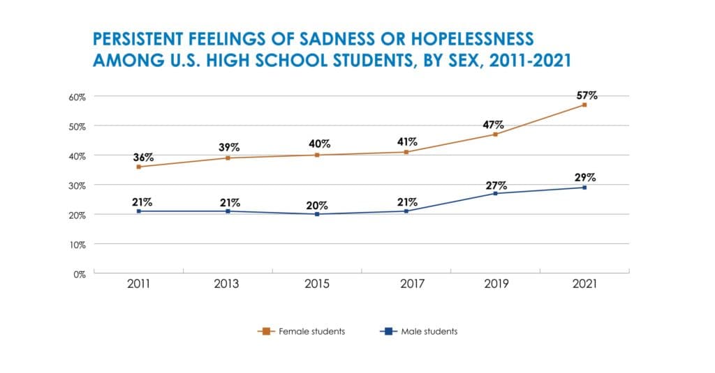 According to the CDC data, “Nearly 3 in 5 (57%) U.S. teen girls felt persistently sad or hopeless in 2021—double that of boys, representing a nearly 60% increase and the highest level reported over the past decade.”