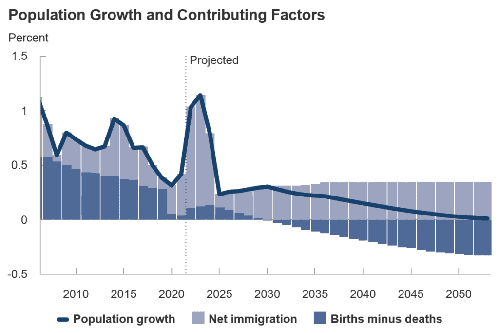The CBO demonstrate how quickly population growth in the United States has been declining over the last few decades. The blue markers show how annual births over deaths will grow even more dramatic through 2050.
