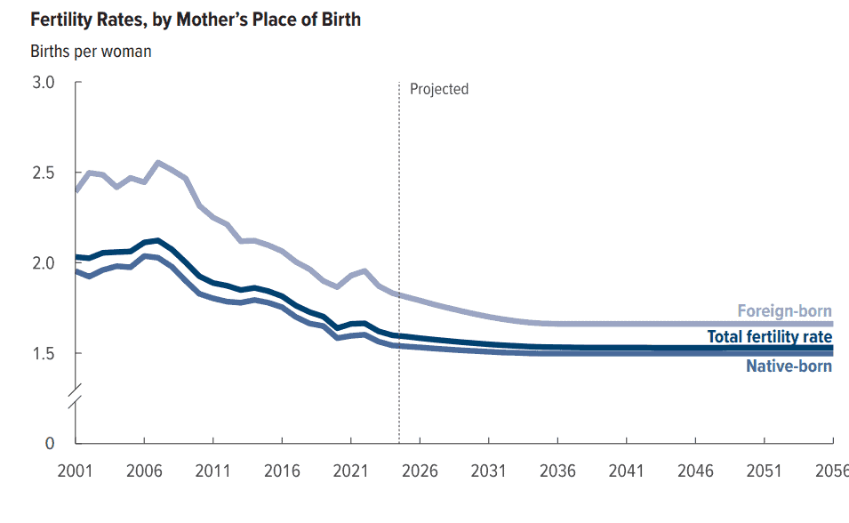 The CBO also projects that the fertility for foreign-born women in the U.S. is expected to outpace the birthrates of native-born women. It is currently at 1.53 births for native-born women, but 1.79 births per foreign-born women. Those numbers are expected to decline to 1.50 and 1.66, respectively in 2036 and stay at roughly that rate through 2056.
