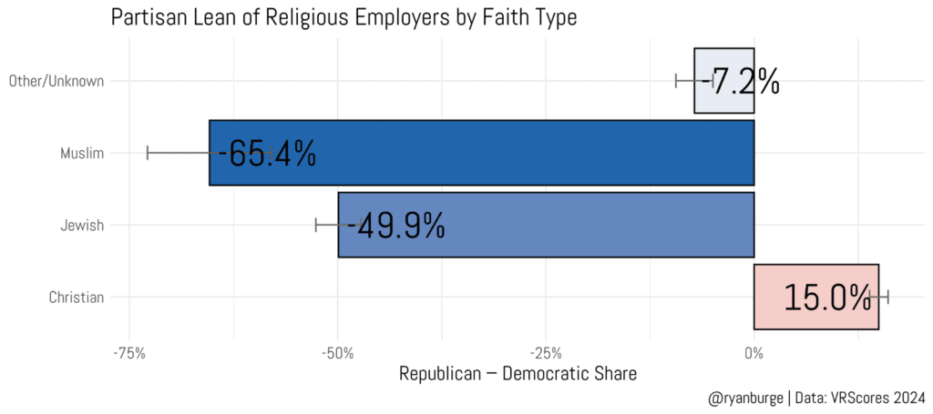 Burge found that Christian-based workplaces were dramatically more likely to lean Right or Republican over and against either Muslim or Jewish employers. The differentials look like this: