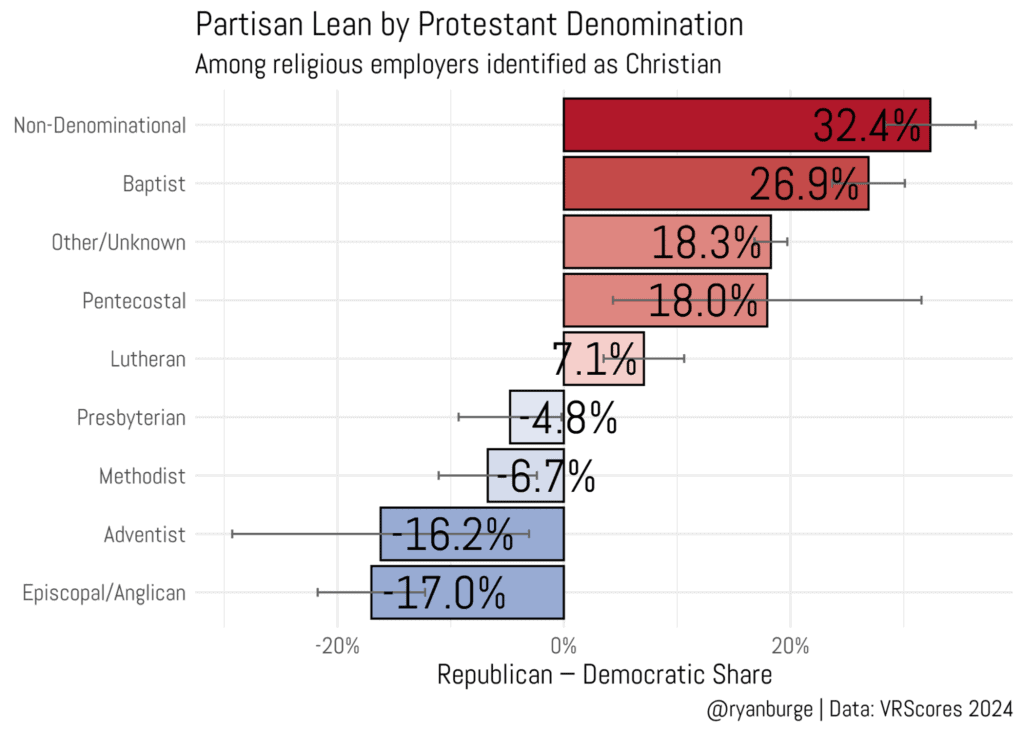 Burge also shows which Christian denominations lean more conservative politically. He explains, “Folks who work for Baptist and non-denominational churches are the most right-leaning, followed by Pentecostals and Lutherans,” adding, “In each case, the Republican share outnumbers the Democratic share.” Non-denominational organization employees clearly lean markedly more conservative in their politics.