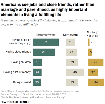 But according to Pew Research, a growing number of young adults today say that having a job or career they enjoy (71%) and having close friends (61%) is more important to them in living a fulfilling life than having children (26%) or being married (23%).