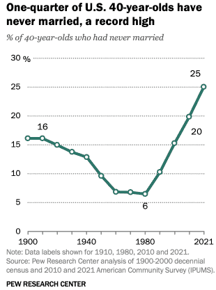 Additionally, Pew Research reports, one-quarter of U.S. 40-year-olds have never married – a record high.