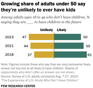 Pew Research has also found that the share of U.S. childless adults under age 50 who say it is unlikely they will ever have kids increased a staggering 10% from 2018 to 2023 – from 37% to 47%.
