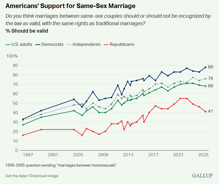 Yet, the big news comes in conservative’s view of both gay marriage and same-sex relationships. While support for same-sex marriage among republicans peaked in 2021 and 2022 at 55%, that support has now plummeted to 41% in 2025. According to Gallup, this is “the lowest point since 2016 after the Obergefell decision.” Support for de-gendered marriage has only seen overall growth among Democrats, reaching a high this year of 88% support. Gallup reports, “The current 47-point gap between Republicans and Democrats is the largest since Gallup first began tracking this measure 29 years ago.”