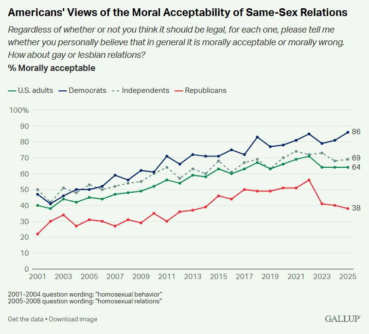 American’s support for the “moral acceptability of same-sex relationships, as Gallup phrased the question, reached its height in 2022 at 71%, but has declined to a steady 64% since 2023. Support for same-sex relationship among conservatives has sunk from a 56% high in 2022 to a dramatically low 38% approval rating this year.