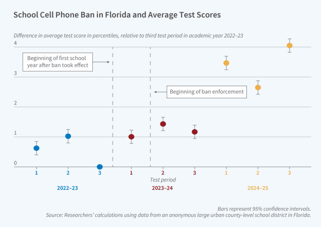 The policy, which the district implemented in September 2023, decreased student cellphone usage by about two-thirds, the study found. Just one year later, in the 2024-2025 school year, students’ test scores increased by an average of 1.1 percentage points.