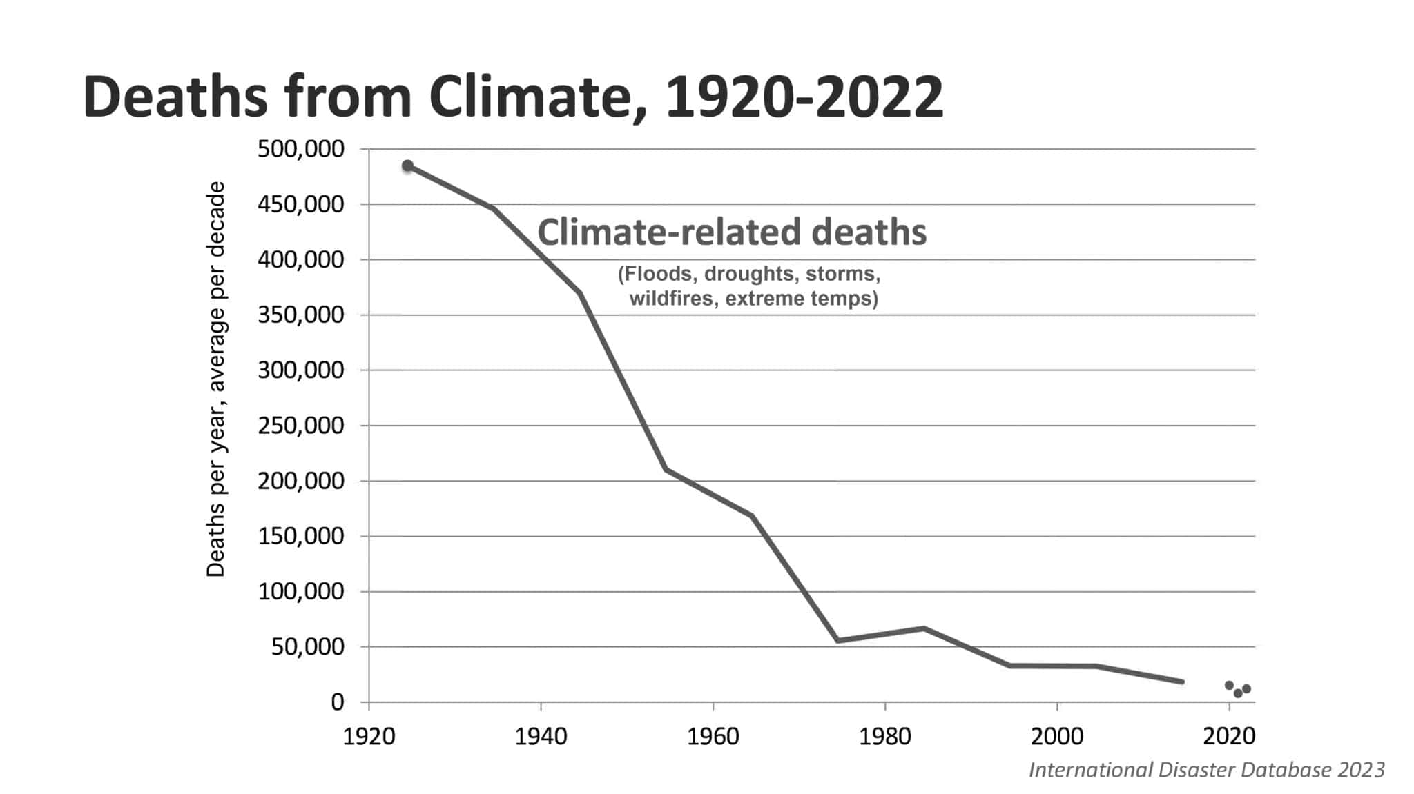 In fact, the news is even better than that. Bjorn Lomborg is president of the Copenhagen Consensus Center and a visiting fellow at the Hoover Institution. In an address at Hillsdale College in April, Mr. Lomborg noted, “In the 1920s, about 500,000 people died each year, on average, due to climate. Looking at the averages in subsequent decades—the number fluctuates quite a bit from year to year—there has been a dramatic decline. In the 2010s, the average number of people dying each year as a result of climate was 18,000, and in 2022, that number dropped to about 11,000. This downward trend doesn’t fit the alarmist narrative, so of course we never hear about it.”