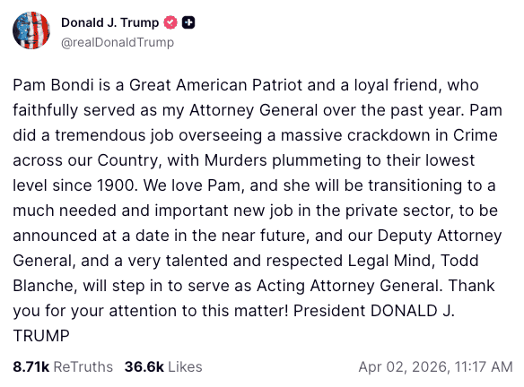 In a post on Truth Social, the president praised Bondi as “a Great American Patriot and a loyal friend” who “did a tremendous job overseeing a massive crackdown in Crime across our Country, with Murders plummeting to their lowest level since 1900.”