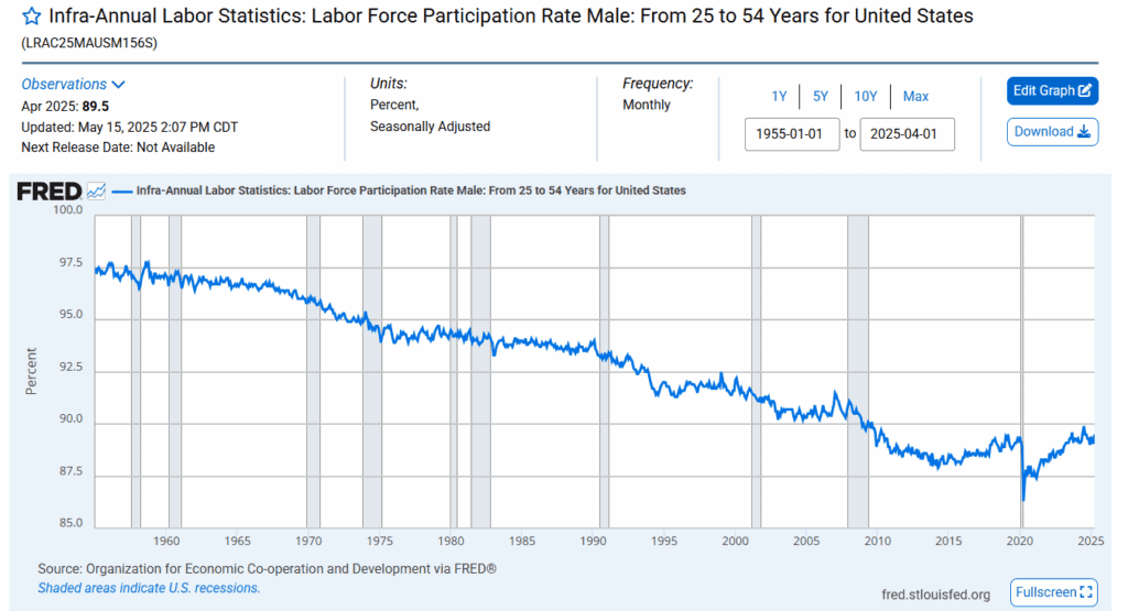 It has long been documented how workforce participation among men has been declining in our nation. You can see the declining trend line for male employment in the United States here. It is not an encouraging picture.
